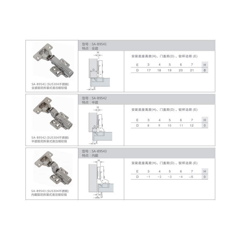 產(chǎn)品名稱:SUS304不銹鋼拆裝阻尼暗鉸鏈 適用范圍:適用各類柜門 主要材質(zhì):304不銹鋼 鉸杯深度:11.5mm 鉸杯直徑:Φ35mm 面板(E)尺寸:3-7mm 門板厚度:14-21mm 最大承重:2只/8KG 主要功能:內(nèi)置阻尼裝置和自閉裝置 主要特點:快拆裝式